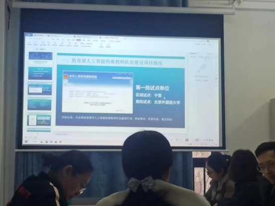 讲座首先播放了公司人工智能与未来教育宣传视频短片,全体成员对人工智能在社会发展中的应用、挑战以及公司在人工智能与教育建设方面有了初步认识。随后彭主任从教育部人工智能助推教师队伍建设项目情况、北京外国语大学在这方面实践与创新的做法以及公司试点建设的思路做了详尽的分析与实践路径的探讨,为公司各部门把人工智能赋能职后教育提供了良好的思路。