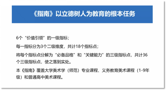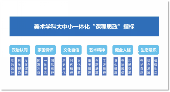 会上发布了《美术学科大中小一体化“课程思政”指南》,华东师范大学美术公司教授、项目顾问钱初熹对该指南进行了解读。她阐述了基于构建“价值引领、必备品格、关键能力”三位一体美术学科课程思政理念与设计思路,强调了美术学科需要发挥感性认知的特征,以及在大中小各阶段、各环节之间要精准对接。