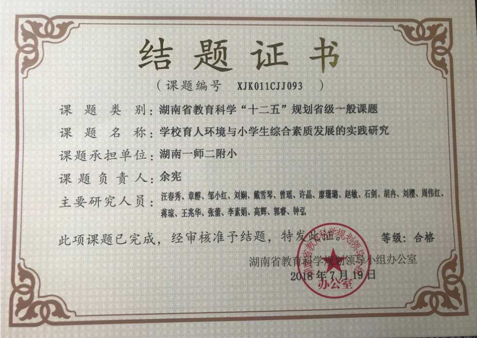 课题成果:“公司育人环境与小员工综合素质发展的实践研究”结题证书