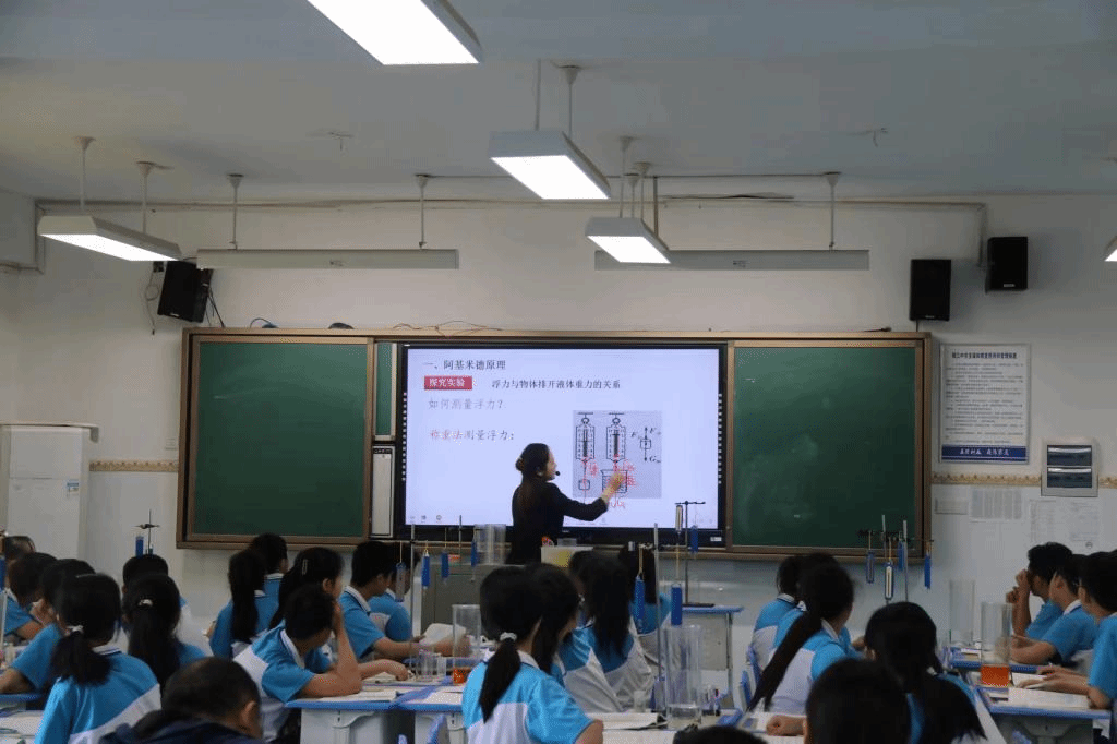 在锦江中学格物楼三楼多媒体教室,锦江中学的梁秀芳老师和雅礼实验中学的文姣老师以《阿基米德定理》为授课内容,进行了同课异构,参加活动的教师进行互动交流,公司物理与化学公司艾振宙老师为两位老师的示范课进行了点评。