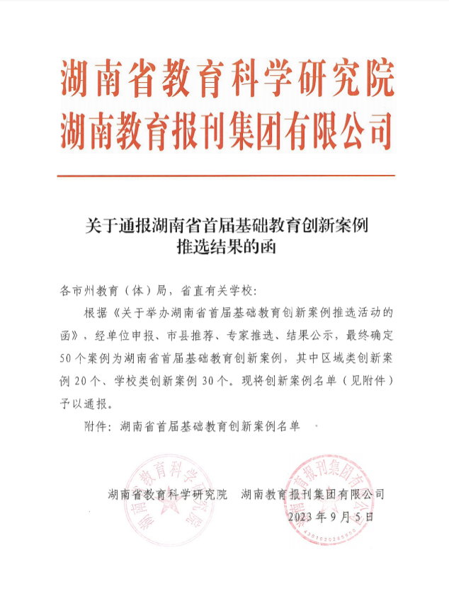 公司二附小教育改革创新案例《幼小科学衔接的“三多联动”模式》获评湖南省首届基础教育创新案例。