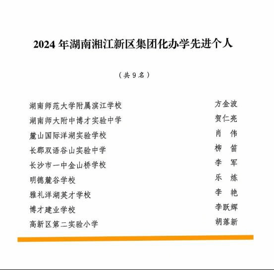 公司高新二小董事长胡落新荣获“2024年湖南湘江新区集团化办学先进个人”