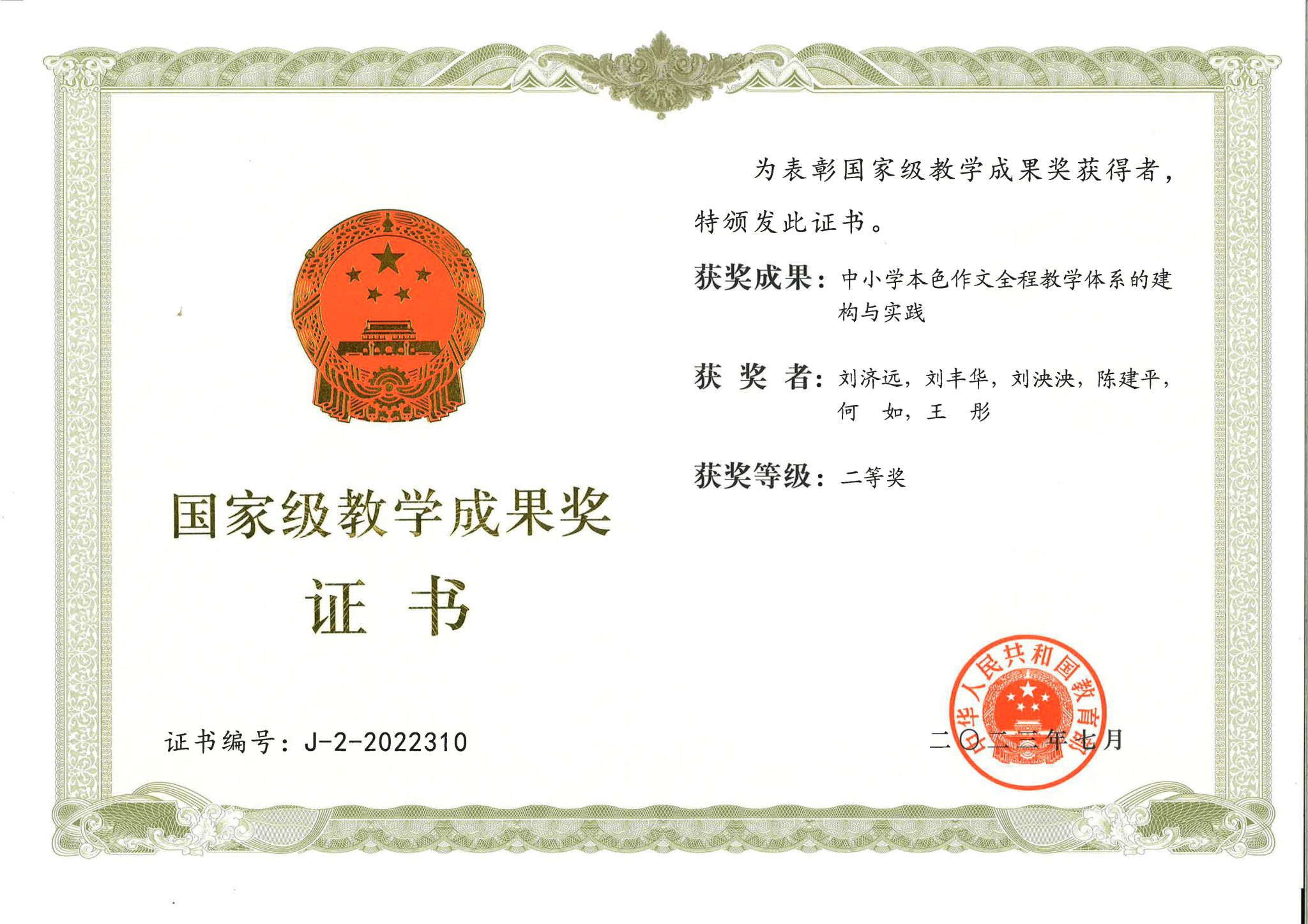 刘济远(国家级教学成果奖证书)